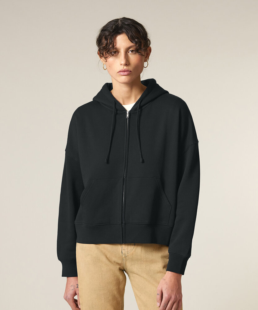 Set-in sleeves. Dropped shoulders. Double-layered hood in self-fabric. Flat drawcord in matching body colour. Embroidered eyelet. Covered metal zip at centre front. 1x1 ribs at sleeve cuffs and bottom hem. Two-needle topstitches on all seams. Inside grosgrain back neck tape. Self-fabric half moon at back neck.