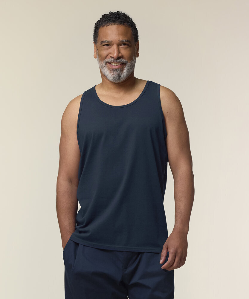 The Stanley Stancer tank top for men. Medium fit. Sleeveless. Self-fabric binding with twin-needle topstitches at collar and armhole. Back neck tape in self-fabric. Twin-needle topstitches at hem.
