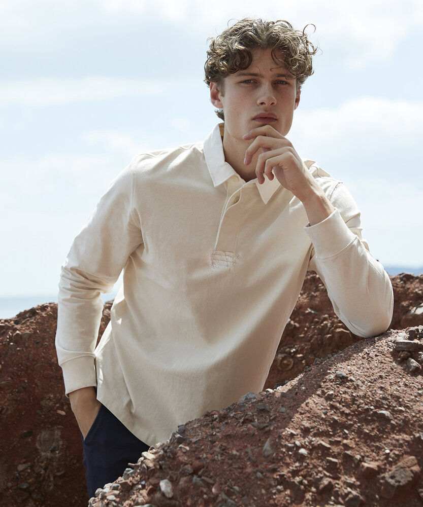 Slimmer fit rugby. Supersoft peached finish. Twin Needle Hems. Side vents with contrast tape detail. Contrast trim in back neck. Dyed to match buttons. Traditional Rugby Collar with cotton webbing. Unbranded: no back neck label. Size tab only with removable house colours swing tag. Matches ladies FR105.