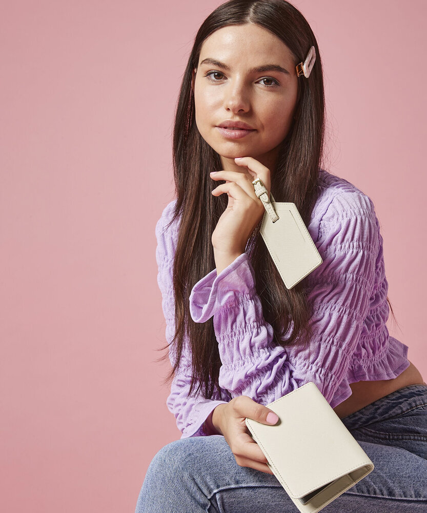 TearAway label for ease of rebranding. Saffiano fine grain. Soft-touch lining. High shine gold metal trims. Two-piece set.
