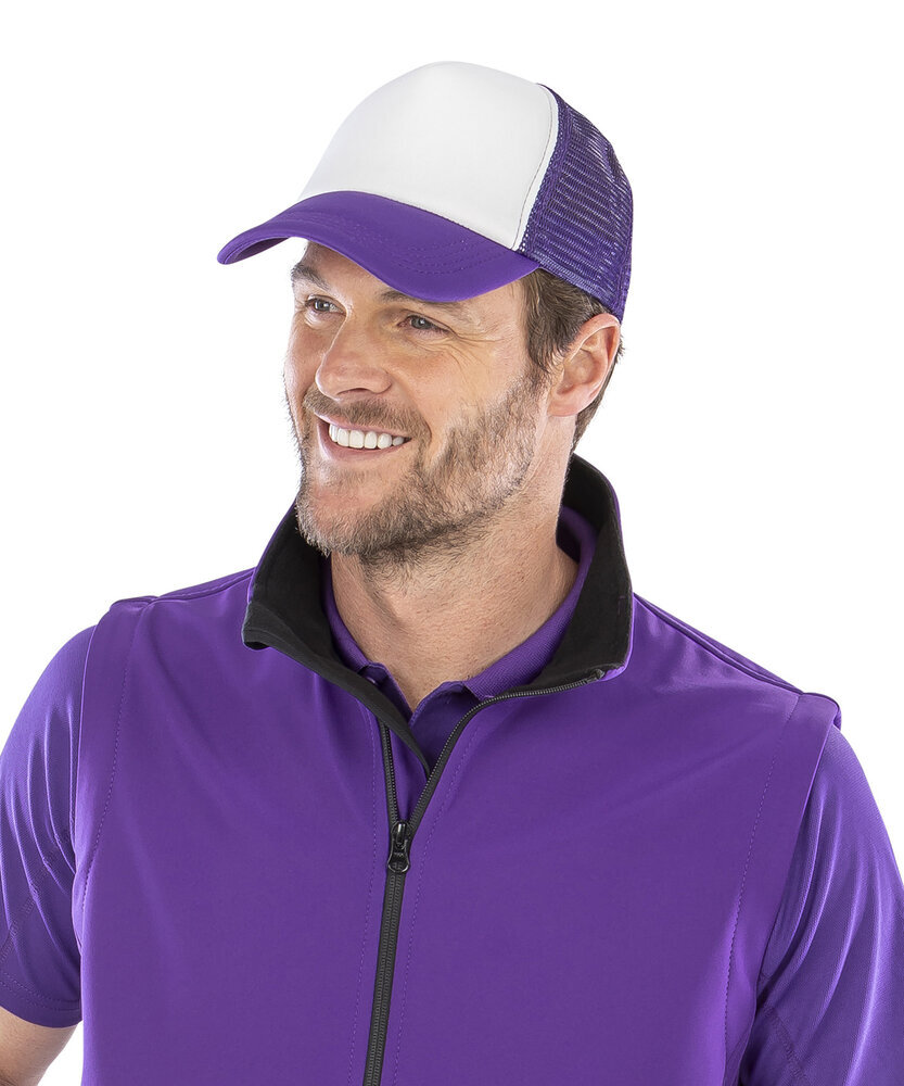 5-panel cap (4 mesh/1 fabric). White front panel with colour contrast mesh and peak. Snapback adjuster. Semi-curved fabric peak made from recycled plastic. Tear-away label.